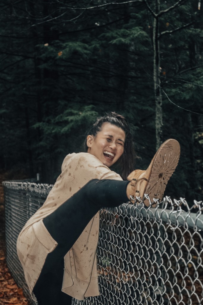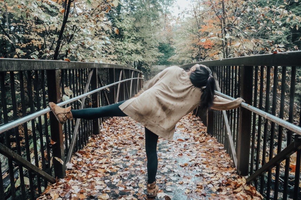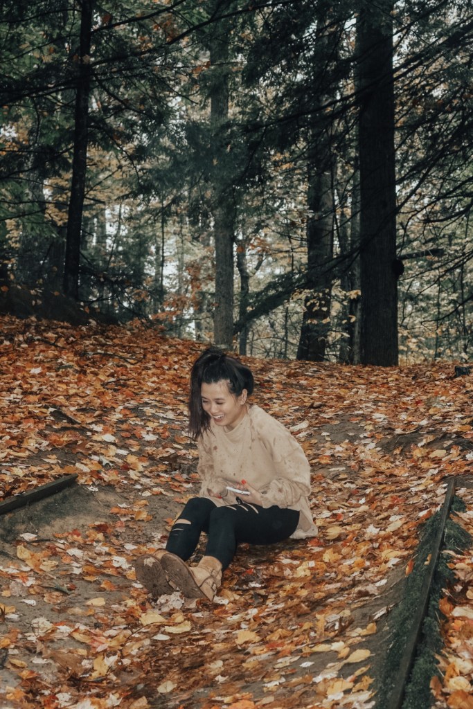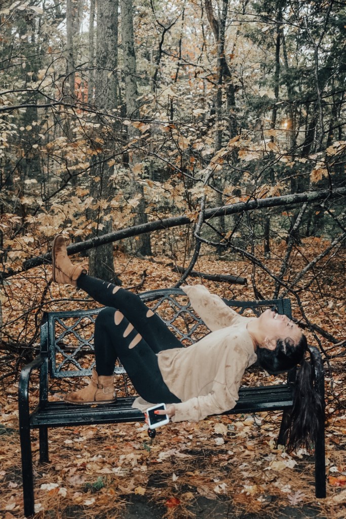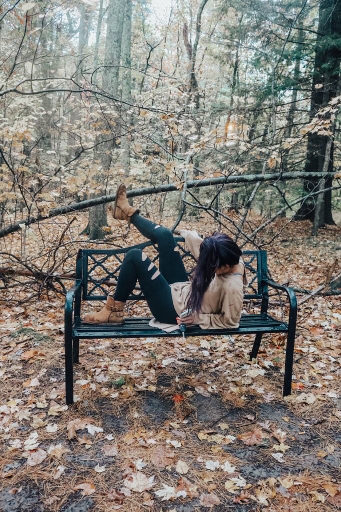 So there was this bench in the middle of the trail. Perfect photo opportunity right? So Vy lays on it and she was saying how could she make this look sexual like with her laying on it and her hair was super damp. First of all I died laughing but then I thought she could just put one leg up and tilt her head back. Maybe not the most perfect idea but it works especially when she’s wearing a sweatshirt and leggings. That’s not the funny part though. That bench is just placed on the ground so if you move to get up, it’ll sway backwards. It almost took out Vy. Then again she did try swaying back and forth to see how far it would go and it has potential to just flip completely over. Not about to get my heart pumping any faster.